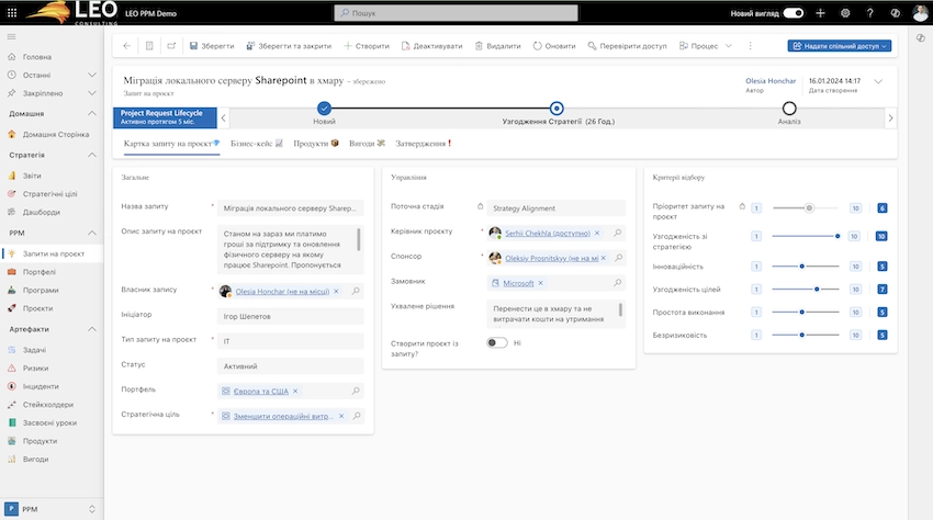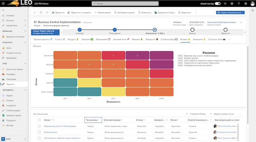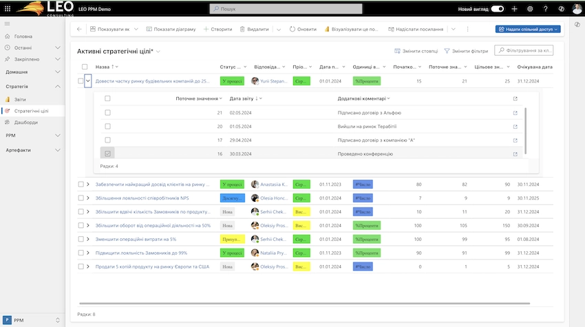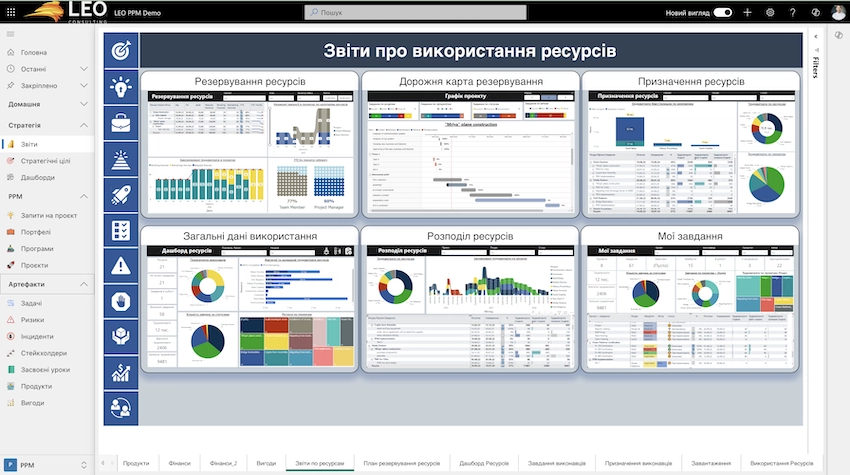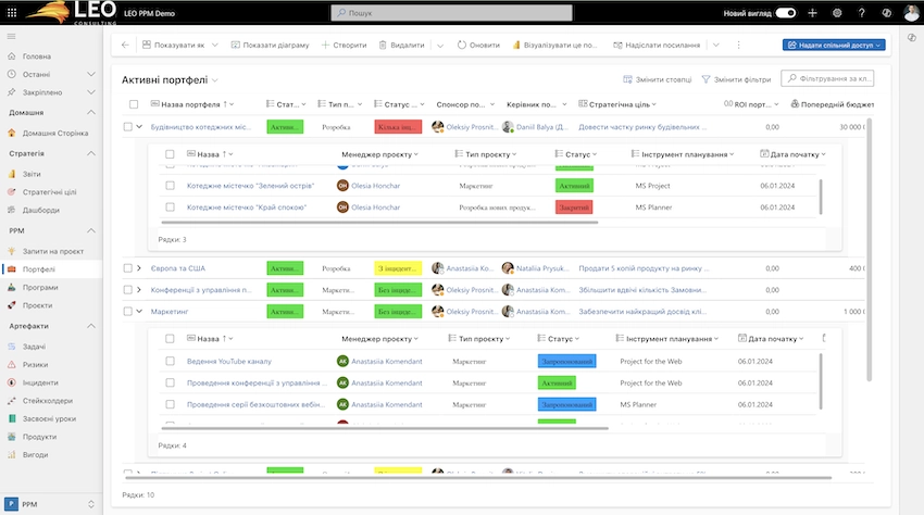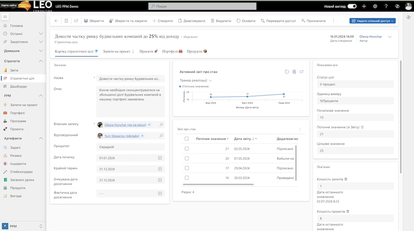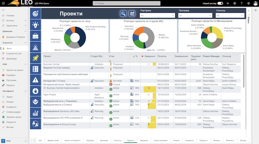 З LEO PPM ми можемо аналізувати загальну кількість проектів в нашому холдингу, визначати, в який портфель вони входять та як вони співвідносяться з цілями та блоками стратегічних цілей компанії. Це дозволяє нам отримати адекватну оцінку своїх можливостей та стан справ щодо реалізації проектів.